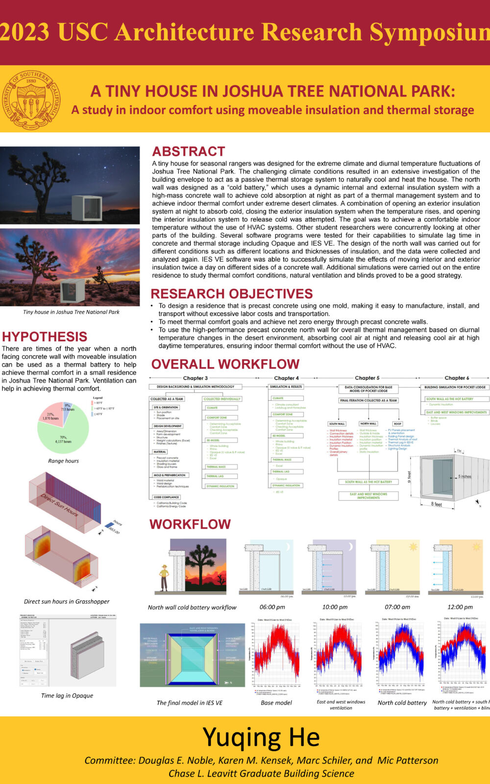 A tiny house for seasonal rangers was designed for the extreme climate and diurnal temperature fluctuations of Joshua Tree National Park. The challenging climate conditions resulted in an extensive investigation of the building envelope to act as a passive thermal storage system to naturally cool and heat the house. The north wall was designed as a “cold battery,” which uses a dynamic internal and external insulation system with a high-mass concrete wall to achieve cold absorption at night as part of a thermal management system and to achieve indoor thermal comfort under extreme desert climates. A combination of opening an exterior insulation system at night to absorb cold, closing the exterior insulation system when the temperature rises, and opening the interior insulation system to release cold was attempted. The goal was to achieve a comfortable indoor temperature without the use of HVAC systems. Other student researchers were concurrently looking at other parts of the building. Several software programs were tested for their capabilities to simulate lag time in concrete and thermal storage including Opaque and IS VE. The design of the north wall was carried out for different conditions such as different locations and thicknesses of insulation, and the data were collected and analyzed again. IES VE software was able to successfully simulate the effects of moving interior and exterior insulation twice a day on different sides of a concrete wall. Additional simulations were carried out on the entire residence to study thermal comfort conditions, natural ventilation and blinds proved to be a good strategy.