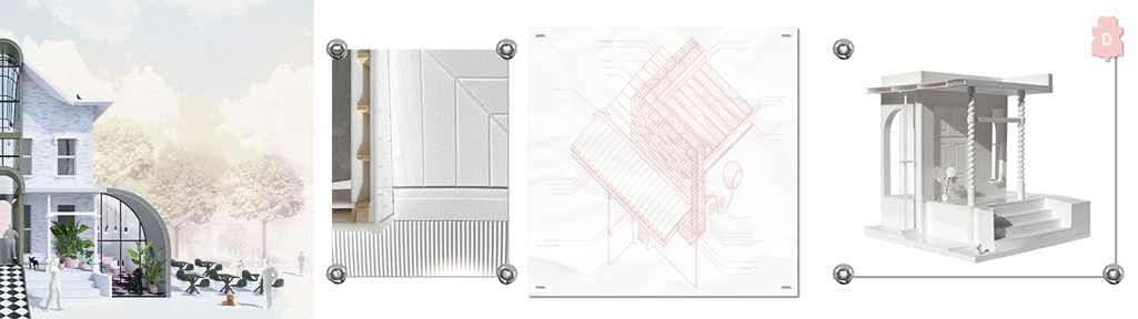 Each hybridization produces strange juxtapositions, singular conditions, comical postures, and chance encounters. These unconventional moments are studied through typical scales of architectural detail (1”=1’-0 detail models and 3”=1’-0” detail drawings), examining varying degrees of exactitude and tectonic expression. While the original district upheld strict guidelines for uniformity, materiality, and traditional single-family ownership, this project celebrates difference, innovation, and new opportunity, speculating on the 21st-century family’s needs as Detroit progresses through an energized era of revitalization and growth.
